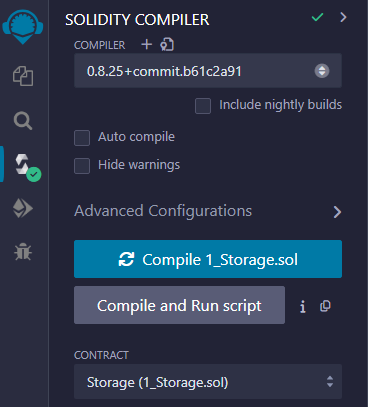 The Solidity logo is present as an icon in the Remix side-bar. Clicking this icon opens the Solidity compiler wizard. This can be used to compile Storage.sol ready. With Solidity.sol open in the editor window, simply click the Compile 1_Storage.sol button. A green tick will appear next to the Solidity icon to confirm that the contract has compiled successfully. This means the contract bytecode is available.