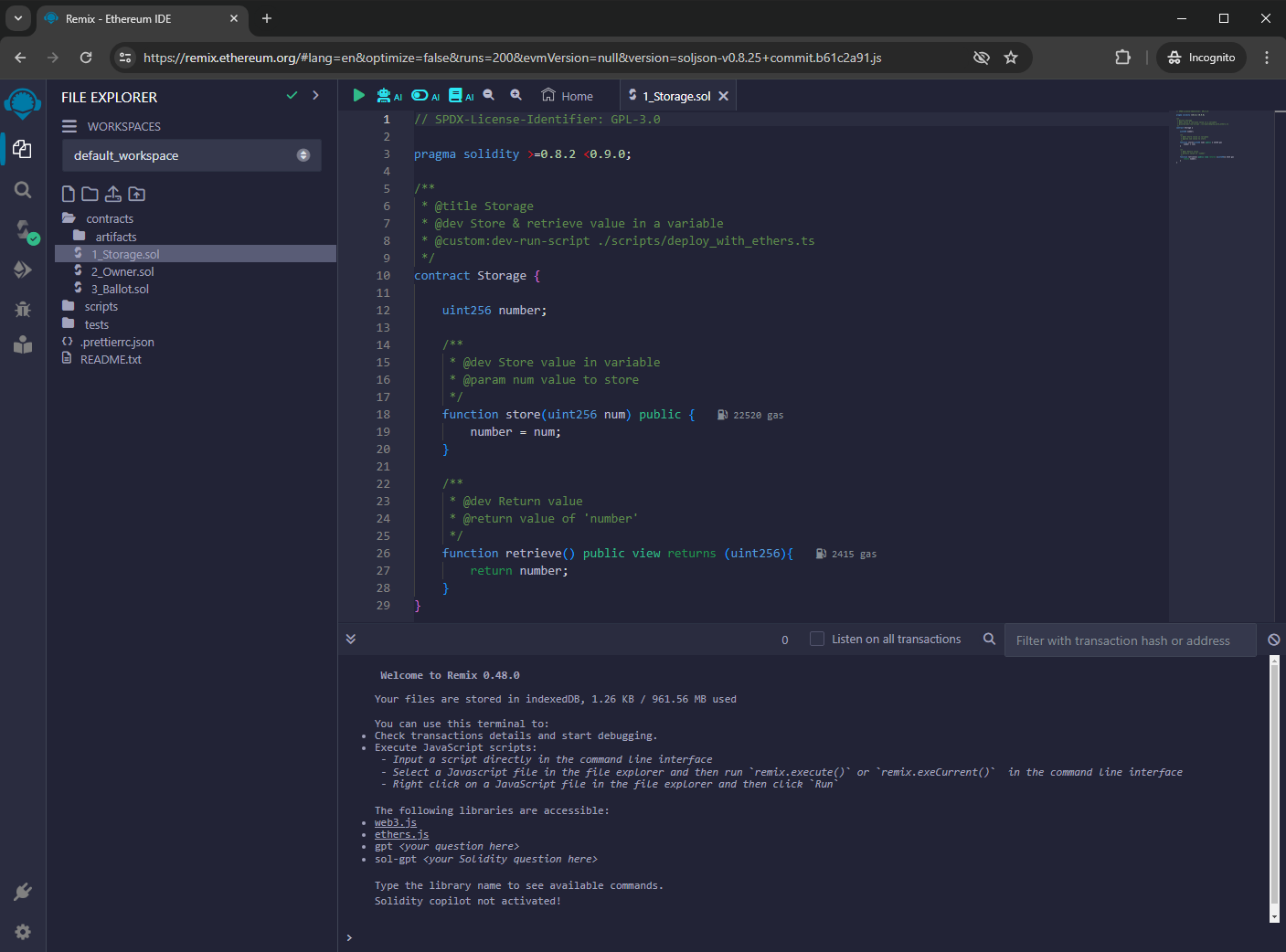 In a web browser, open https://remix.ethereum.org. This opens an online smart contract development environment. On the left-hand side of the screen there is a side-bar menu that toggles between several toolboxes that are displayed in a vertical panel. On the right hand side of the screen there is an editor and a terminal. This layout is similar to the default layout of many other IDEs such as VSCode. The contract defined in the previous section, Storage.sol is already available in the Contracts directory in Remix. It can be opened and reviewed in the editor.