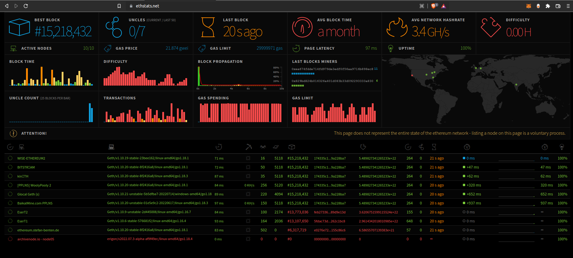 Note that the Ethstats dashboard is not a reliable source of information about the entire Electroneum network because submitting data to the Ethstats server is voluntary and has to be configured by individual nodes. Therefore, many nodes are omitted from the summary statistics.