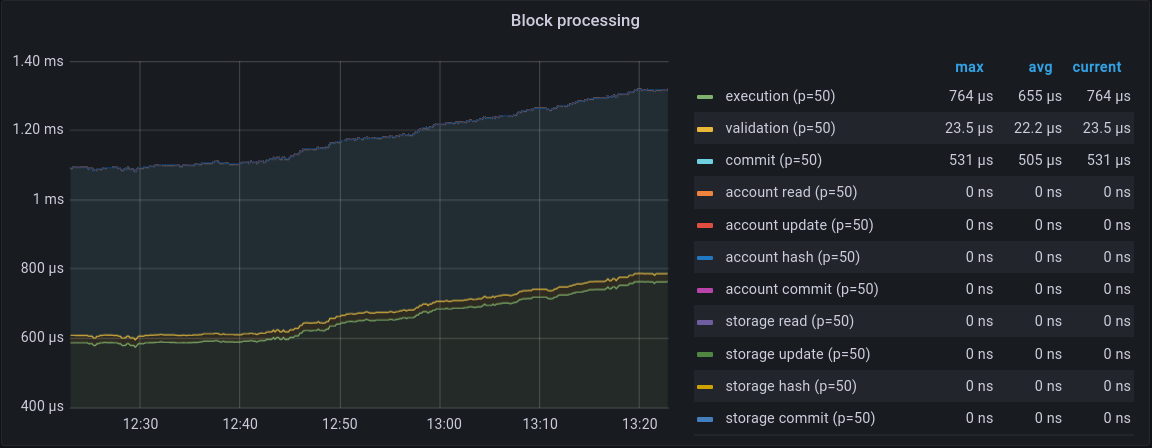 The block processing panel tracks the time taken to complete the various tasks involved in processing each block, measured in microseconds or nanoseconds. Specifically, this includes: