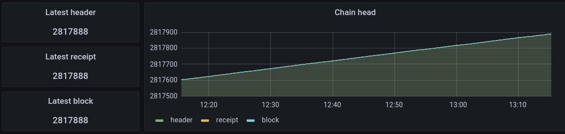 Our dashboards page explains how to set up a Grafana dashboard for monitoring your Etn-sc node. This page explores the dashboard itself, explaining what the various metrics are and what they mean for the health of a node. Note that the raw data informing the dashboard can be viewed in JSON format in the browser by navigating to the ip address and port passed to --metrics.addr and --metrics.port (127.0.0.1:6060 by default).
