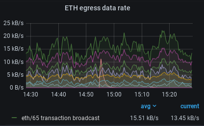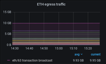 Egress is the process of data leaving the local node and being transferred to its peers. This panel shows the rate that data specifically using the eth subprotocol is leaving the local node in units of kB/s (kilobytes per second). Make sure your dashboard includes the latest version of the eth subprotocol!