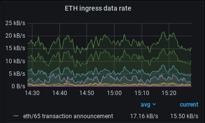 Ingress is the process of data arriving at the local node from its peers. This panel shows the rate that data specifically using the eth subprotocol is arriving at the local node in units of kB/s (kilobytes per second). The data is subdivided into specific versions of the ETH subprotocol. Make sure your dashboard includes the latest version of the eth subprotocol!