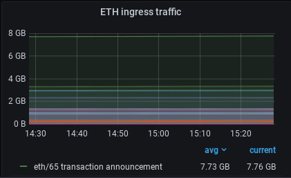 Ingress is the process of data arriving at the local node from its peers. This panel shows a moment-by-moment snapshot of the amount of data that is arriving at the local node, specifically using the eth subprotocol, in units of GB (gigabytes). Make sure your dashboard includes the latest version of the eth subprotocol!