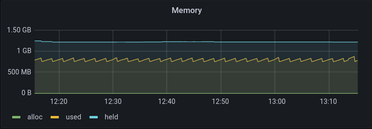 Memory tracks the amount of RAM being used by Etn-sc. Three metrics are plotted: the cache size, i.e. the total RAM reserved for Etn-sc (default 1024 MB) is plotted as held; the amount of the cache actually being used by Etn-sc is plotted as used; the number of bytes being allocated by the system per second is plotted as alloc.