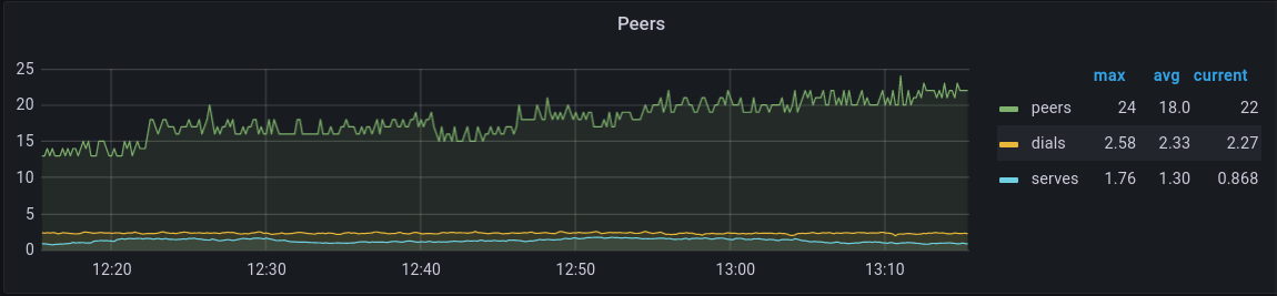 The Peers panel shows the number of individual peers the local node is connected to. The number of dials issued by Etn-sc per second and the number of external connections received per second are also tracked in this panel.