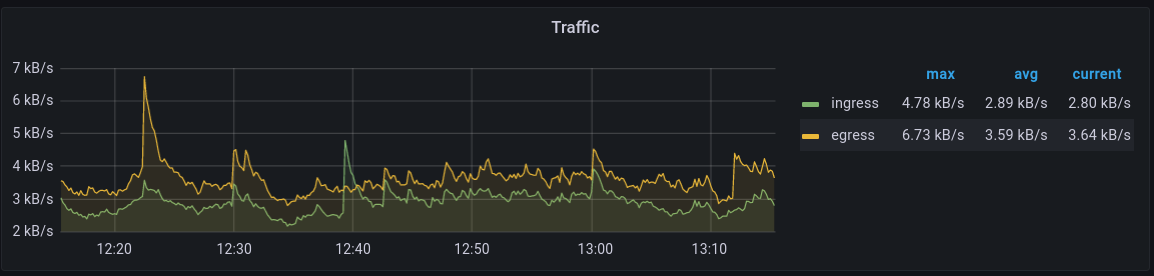 The Traffic panel shows the rate of data ingress and egress for all subprotocols, measured in units of kB/s.