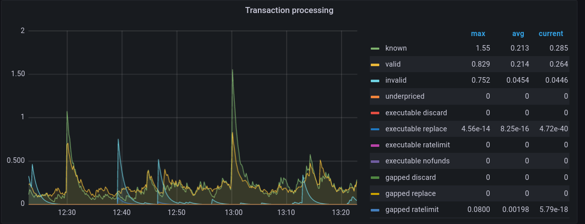 Etn-sc has a capacity for pending transactions defined by --txpool.globalslots (default is 5160). The number of slots filled with transactions is tracked as slots. The transactions in the pool are divided into pending transactions and queued transactions. Pending transactions are ready to be processed and included in a block, whereas queued transactions are those whose transaction nonces are out of sequence. Queued transactions can become pending transactions if transactions with the missing nonces become available. In the dashboard pending transactions are labelled as executable and queued transactions are labelled gapped. The subset of those global transactions that originated from the local node are tracked as local.