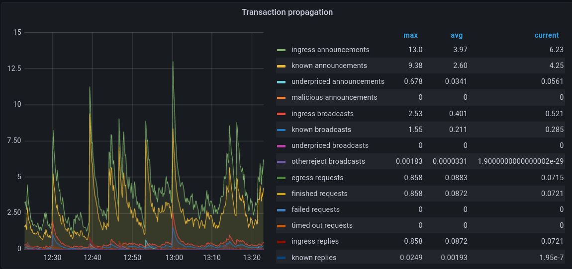 Transaction propagation tracks the sending and receiving of transactions on the peer-to-peer network. This includes: